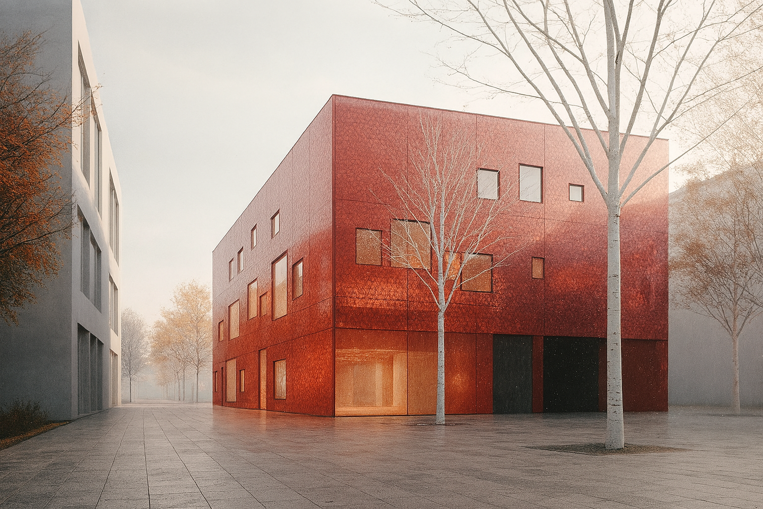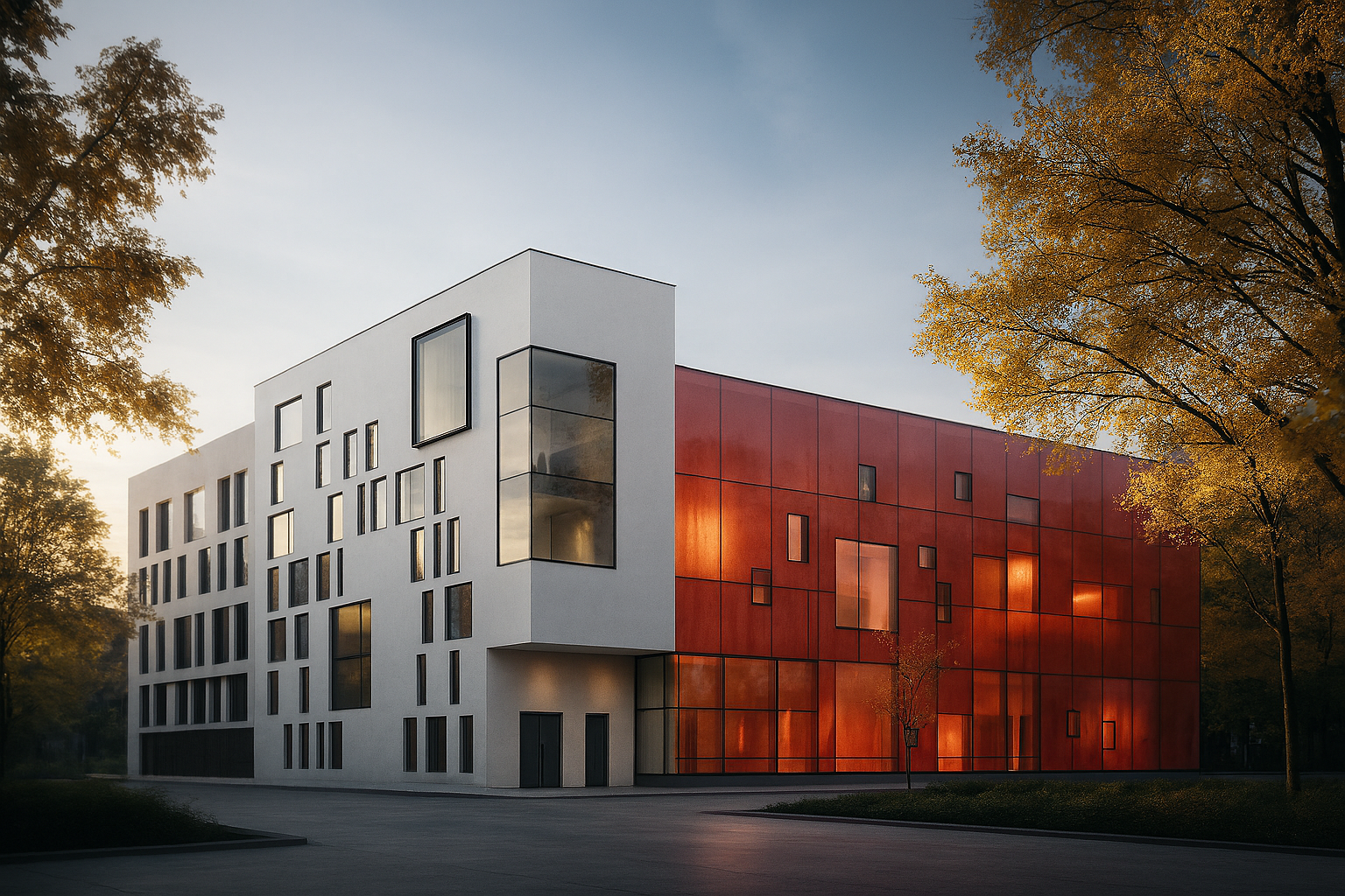 Der Entwurf für die Neuerrichtung der Grundschule Reinhardswald setzt auf eine offene, helle Architektur mit großflächigen Fensteranteilen, die eine direkte Verbindung zwischen Innen- und Außenraum schaffen. Transparente und transluzente Flächen wechseln sich ab und erzeugen ein spannungsvolles Spiel aus Licht, Farbe und Sichtbeziehungen. Farbakzente im Innen- und Außenbereich unterstützen die Orientierung und fördern eine freundliche, inspirierende Lernatmosphäre. Die flexibel nutzbaren Lernbereiche, kombiniert mit großzügigen Aufenthalts- und Bewegungszonen, schaffen einen modernen Bildungsraum, der den Bedürfnissen von Schüler:innen, Lehrkräften und der Gemeinschaft gleichermaßen gerecht wird.