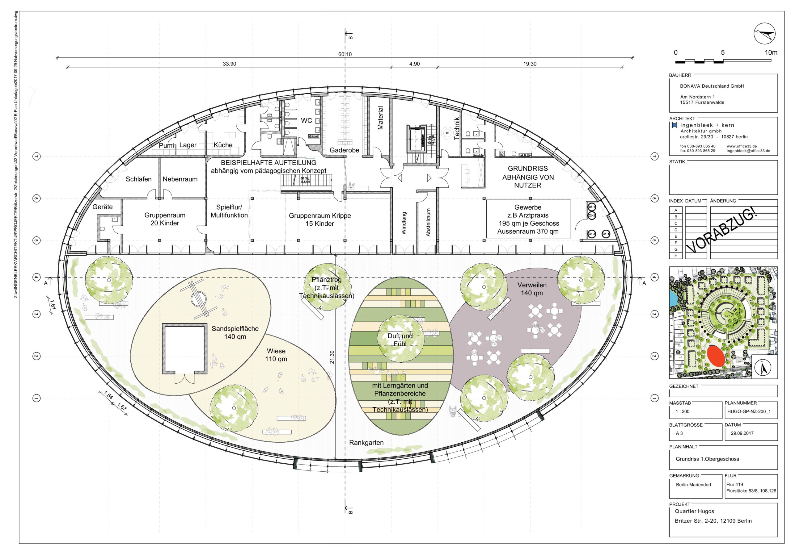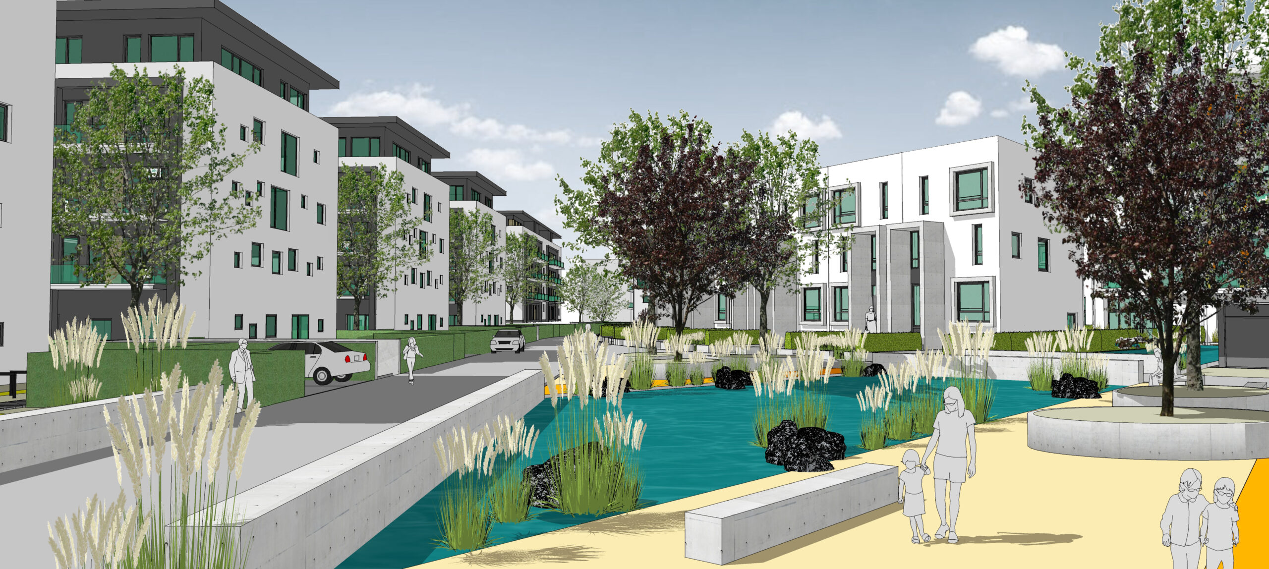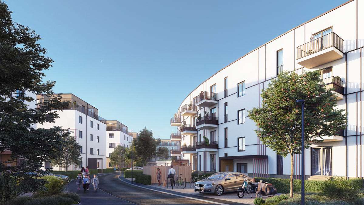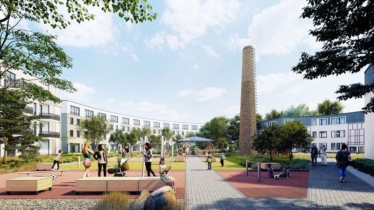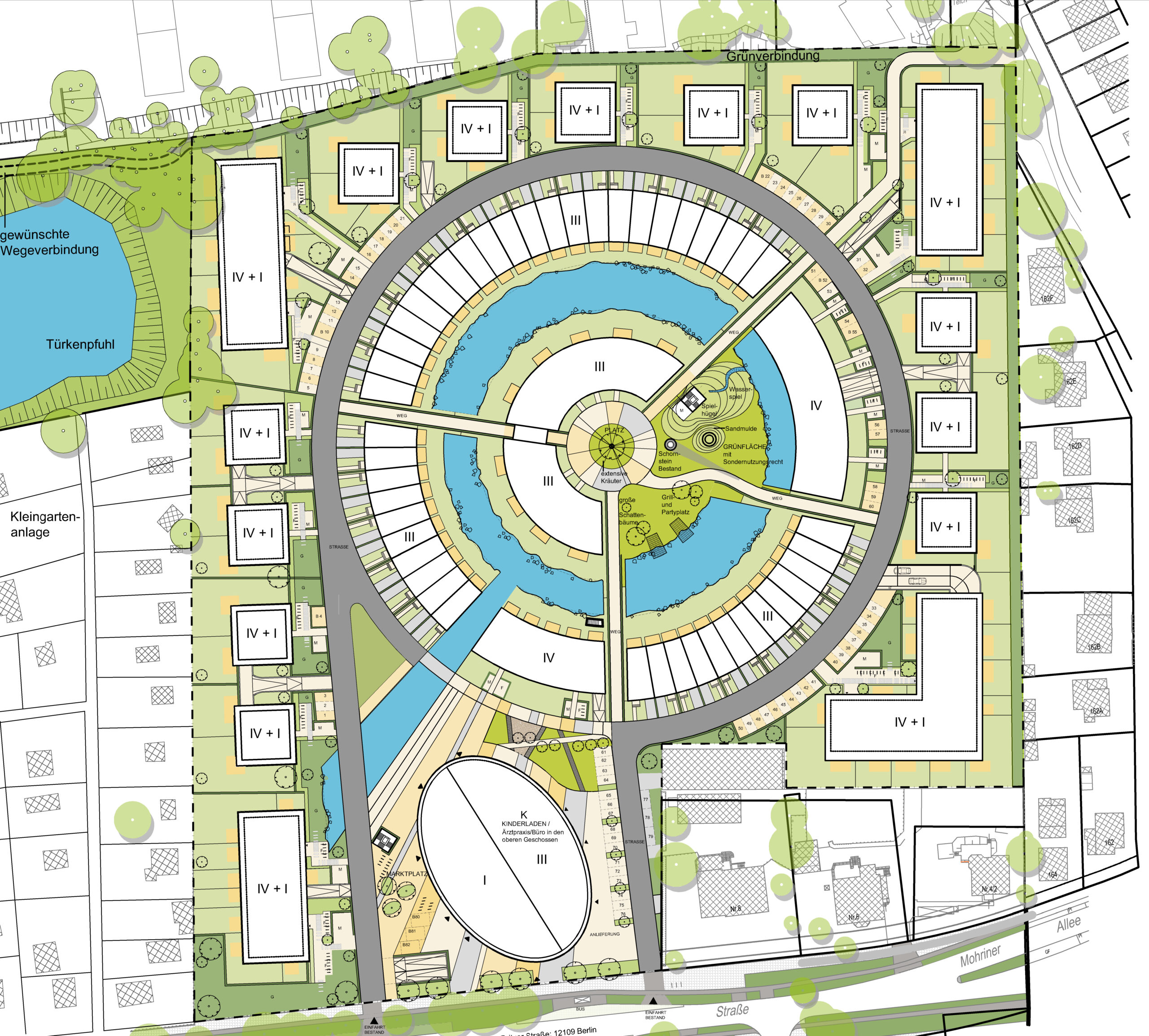 Für das ca. 50.000 m² große Grundstück an der Britzer Straße 2–20 in Berlin-Mariendorf wurde ein vorhabenbezogener Bebauungsplan erarbeitet. Vorgesehen ist ein vielfältiges Wohnquartier mit Reihenhäusern, Geschosswohnungsbau sowie Angeboten für Familien, Senioren und Baugruppen. Ergänzt wird das Ensemble durch ein Nahversorgungszentrum mit Supermarkt, Einzelhandel, Kita und gemeinschaftlich nutzbaren Flächen. Zentrales Element ist ein Platz mit umliegender Bebauung, Wasserflächen und naturnah gestalteten Grünräumen nach dem Prinzip der Permakultur – eingebettet in ein hochwertiges, identitätsstiftendes Gestaltungskonzept.