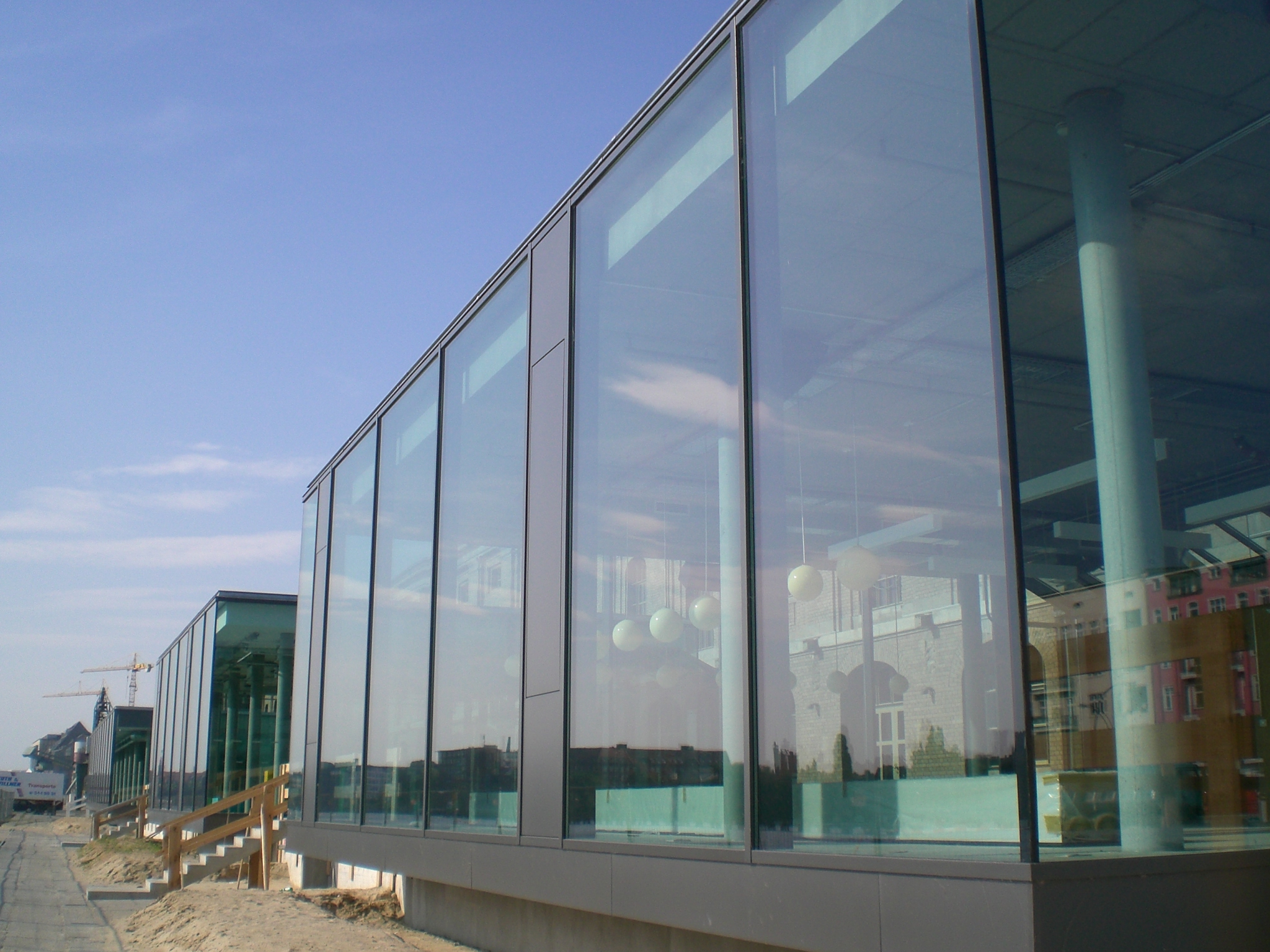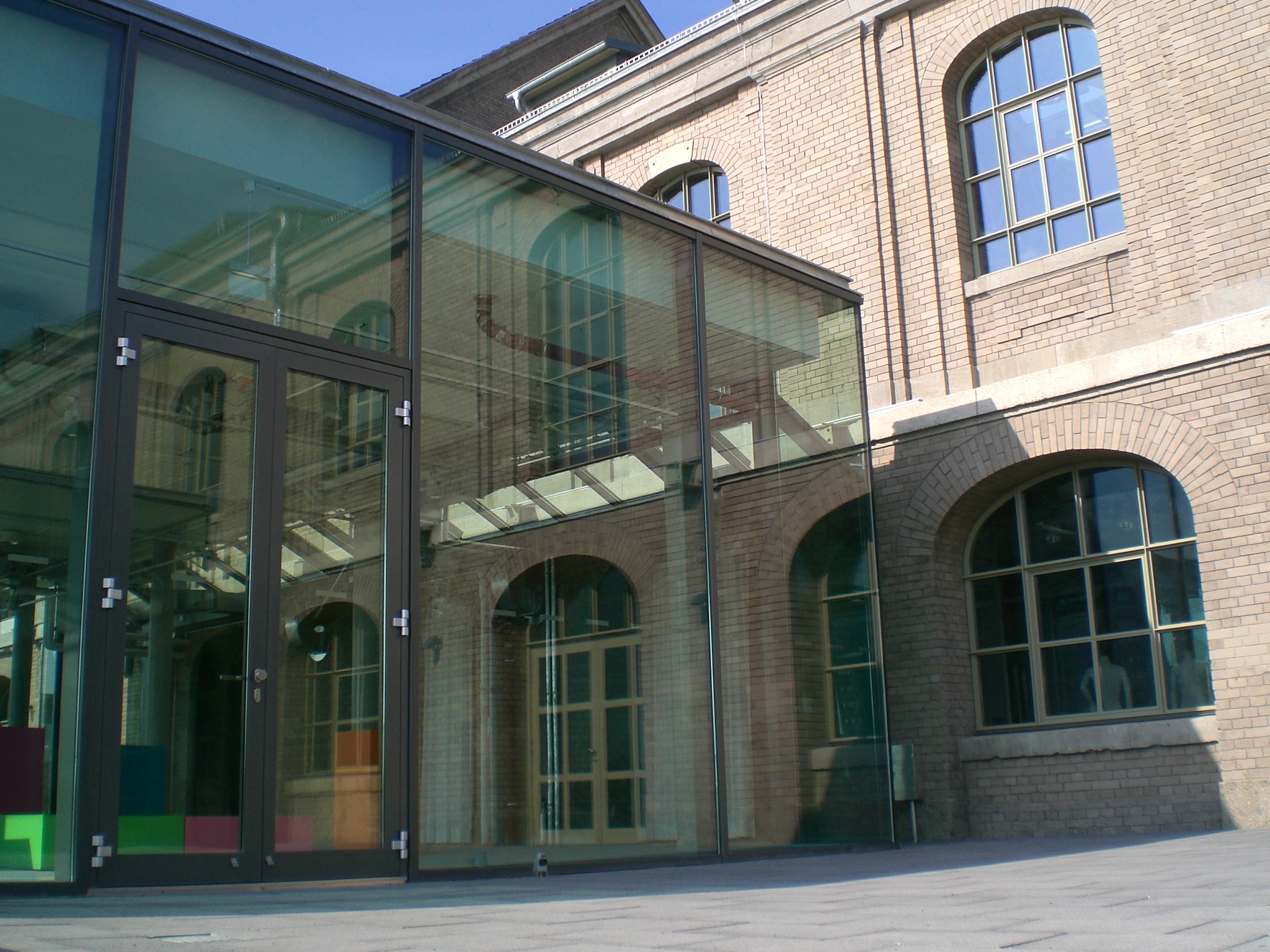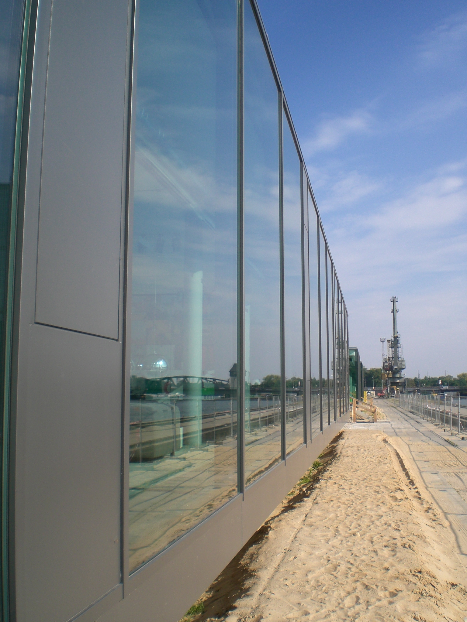 Im Rahmen der behutsamen Sanierung der historischen „Lagerhalle Ost“ am Berliner Osthafen entstand ein einzigartiger Showroom-Komplex für Modelabels. Das um 1900 errichtete Speichergebäude mit markanter Klinkerfassade wurde denkmalgerecht revitalisiert und durch drei gläserne Pavillons an der Spreeseite ergänzt. Die transparenten Glasanbauten erinnern in ihrer Anmutung an Schiffscontainer und fügen sich zurückhaltend in das industrielle Erscheinungsbild ein, ohne den Charakter der historischen Backsteinarchitektur zu stören. Auf über 2.500 m² entstand so eine außergewöhnliche Verbindung aus Geschichte und zeitgenössischem Design.