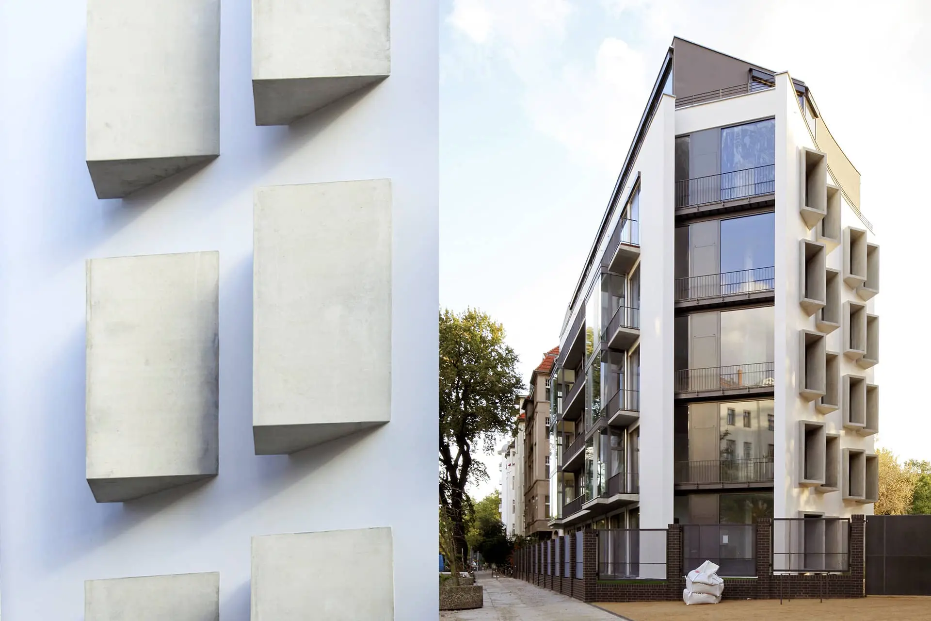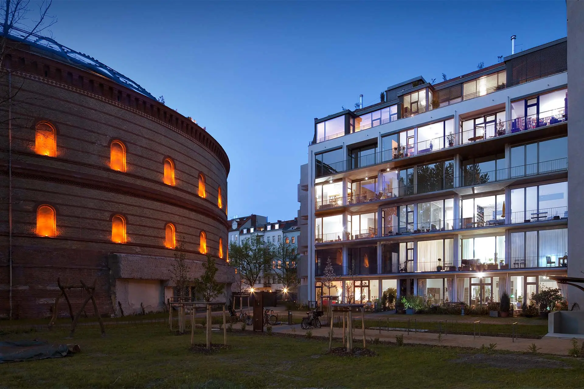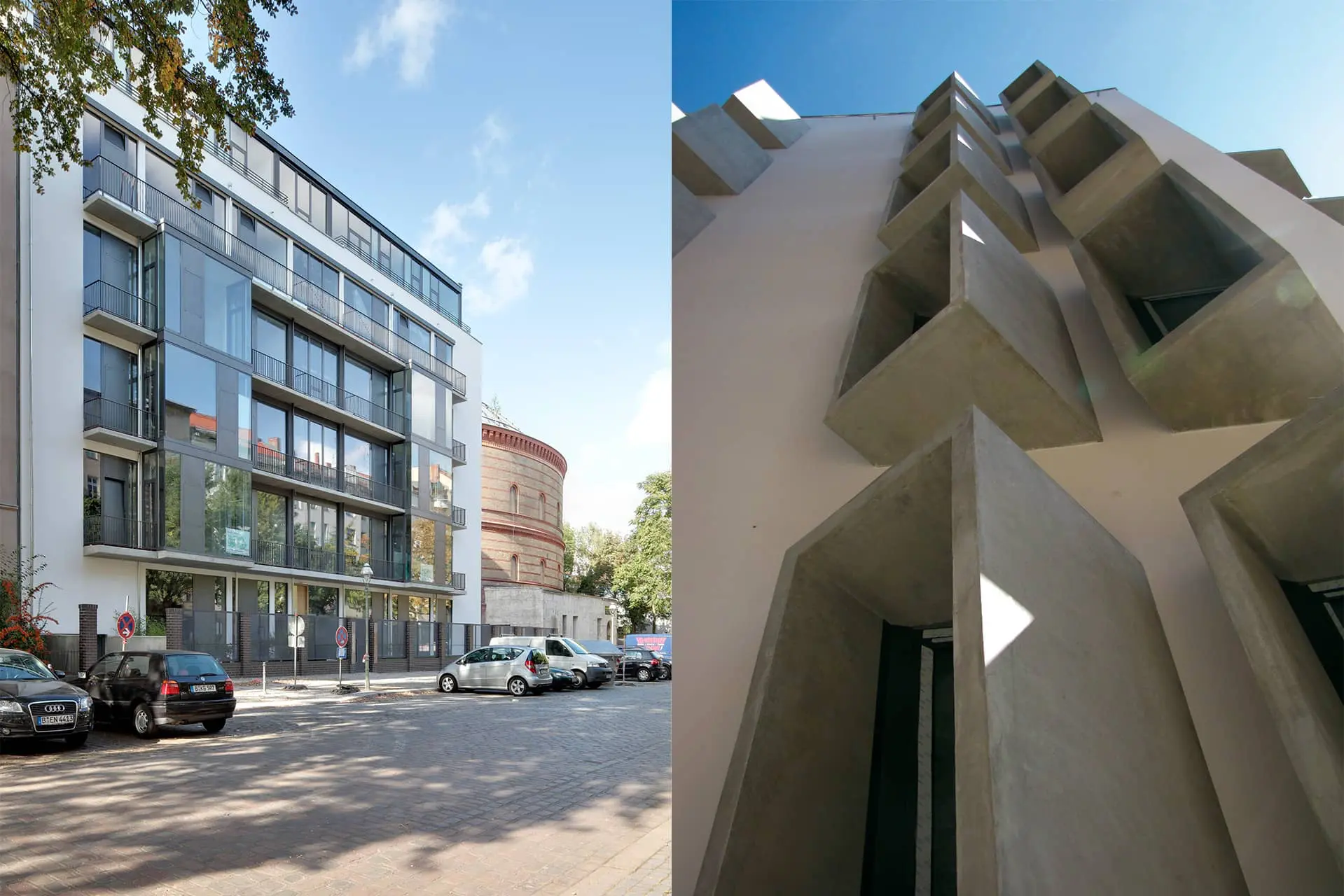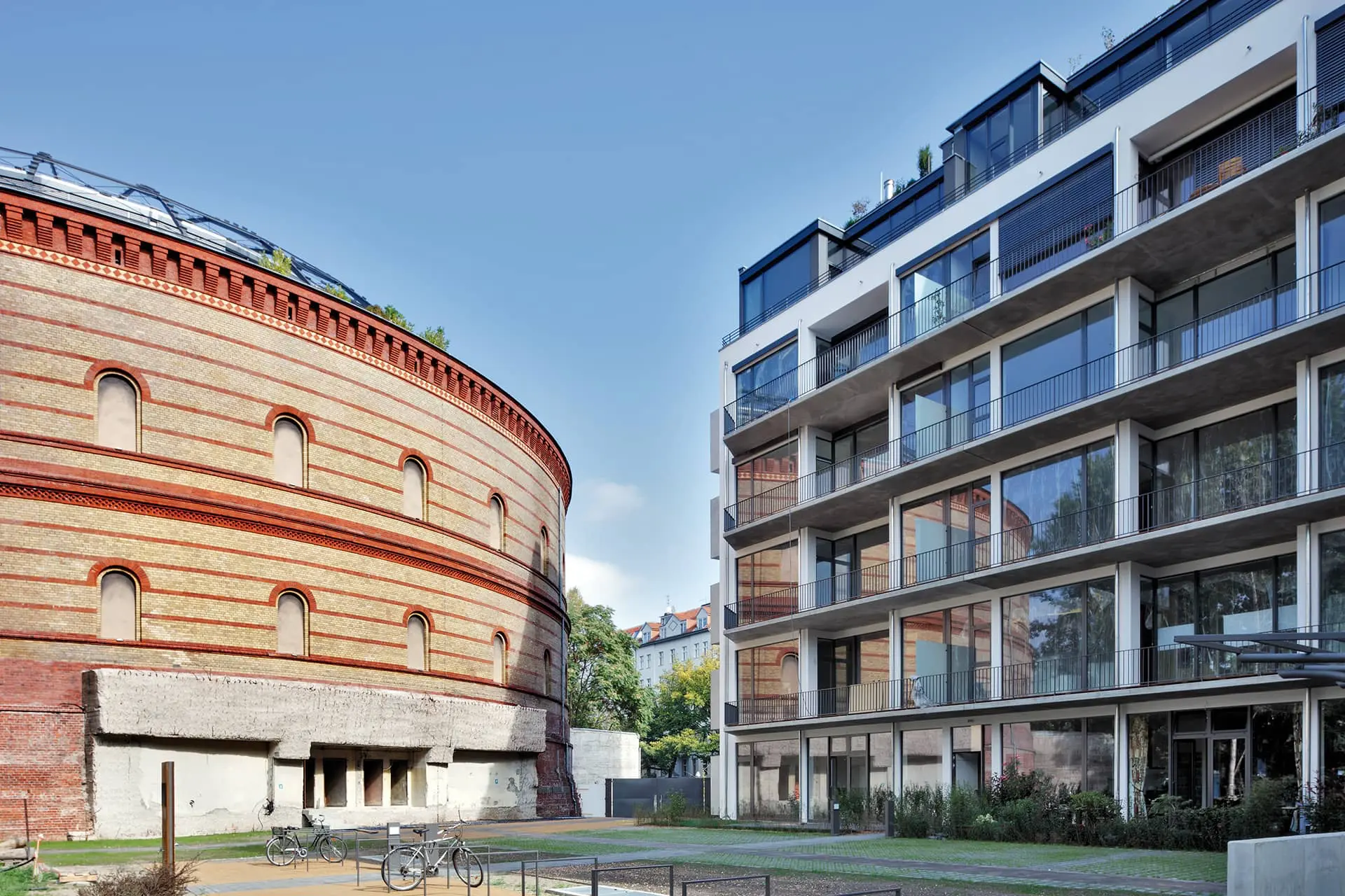 Dennoch kann sich das Wohngebäude mit zeitgemäßer Materialwahl und Formensprache als eigenständiger Bau neben dem alten Gasometer und den großzügigen Stuckaltbauten behaupten und zeitgemäß integrieren.