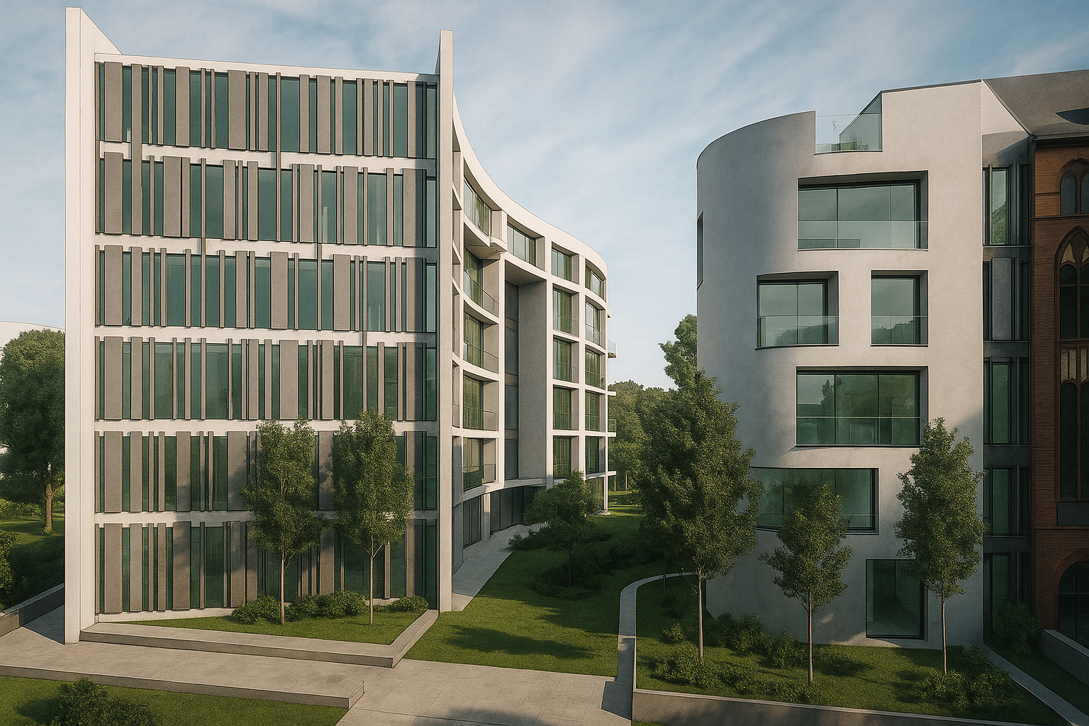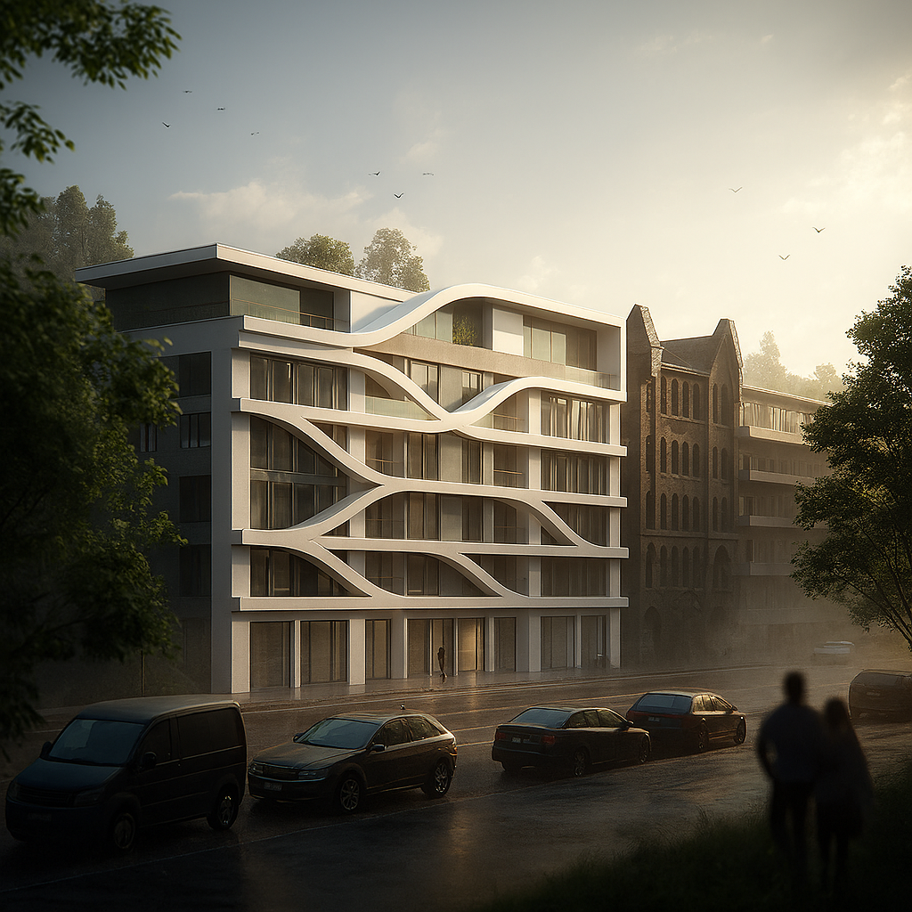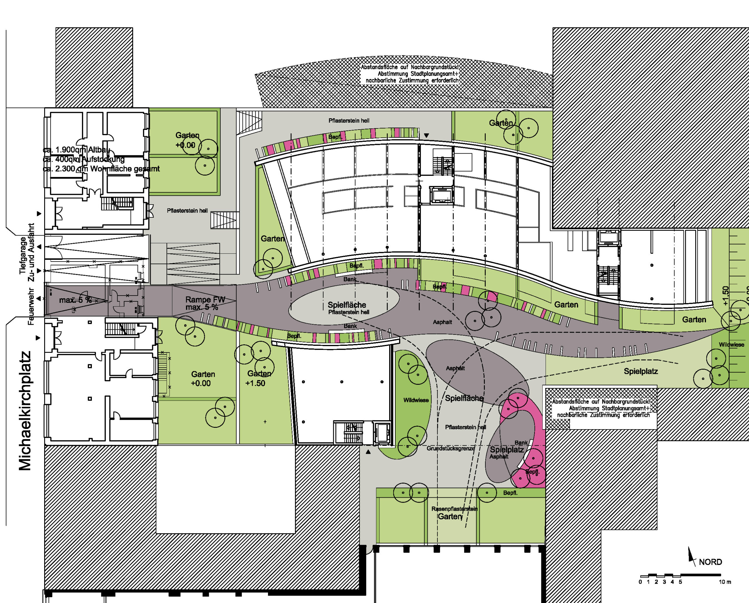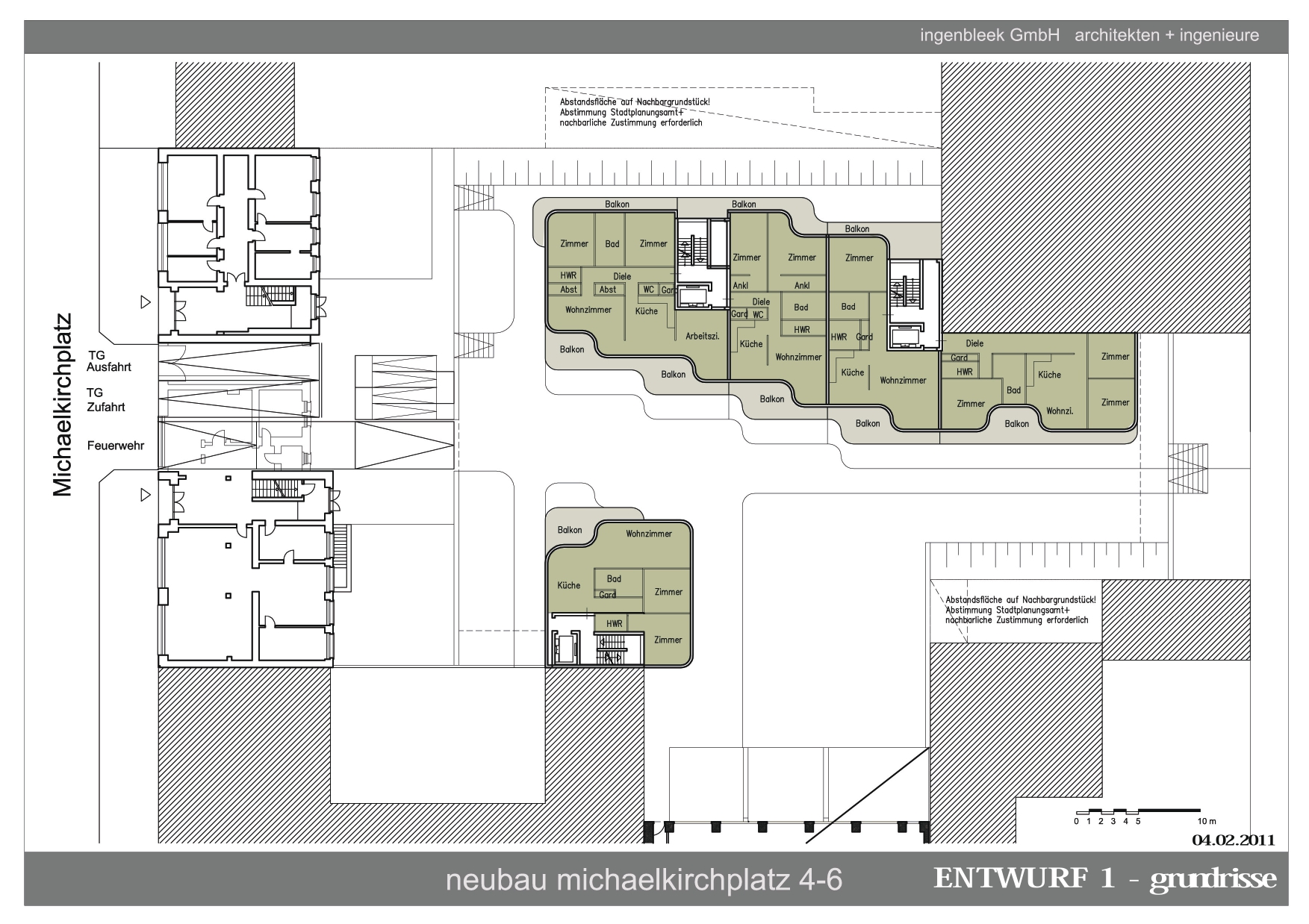 Die städtische Verdichtung des Blockinneren hinter dem Michaelkirchplatz war Ausgangspunkt für den Entwurf eines Wohngebäudes, welches die vorhandenen Blickmöglichkeiten auf dem Grundstück weiterhin ermöglicht. Es entstanden zwei sanft gewogene Wohnriegel mit Spiel von Licht und Schatten, Fenster und Fassadendurchbrüchen.