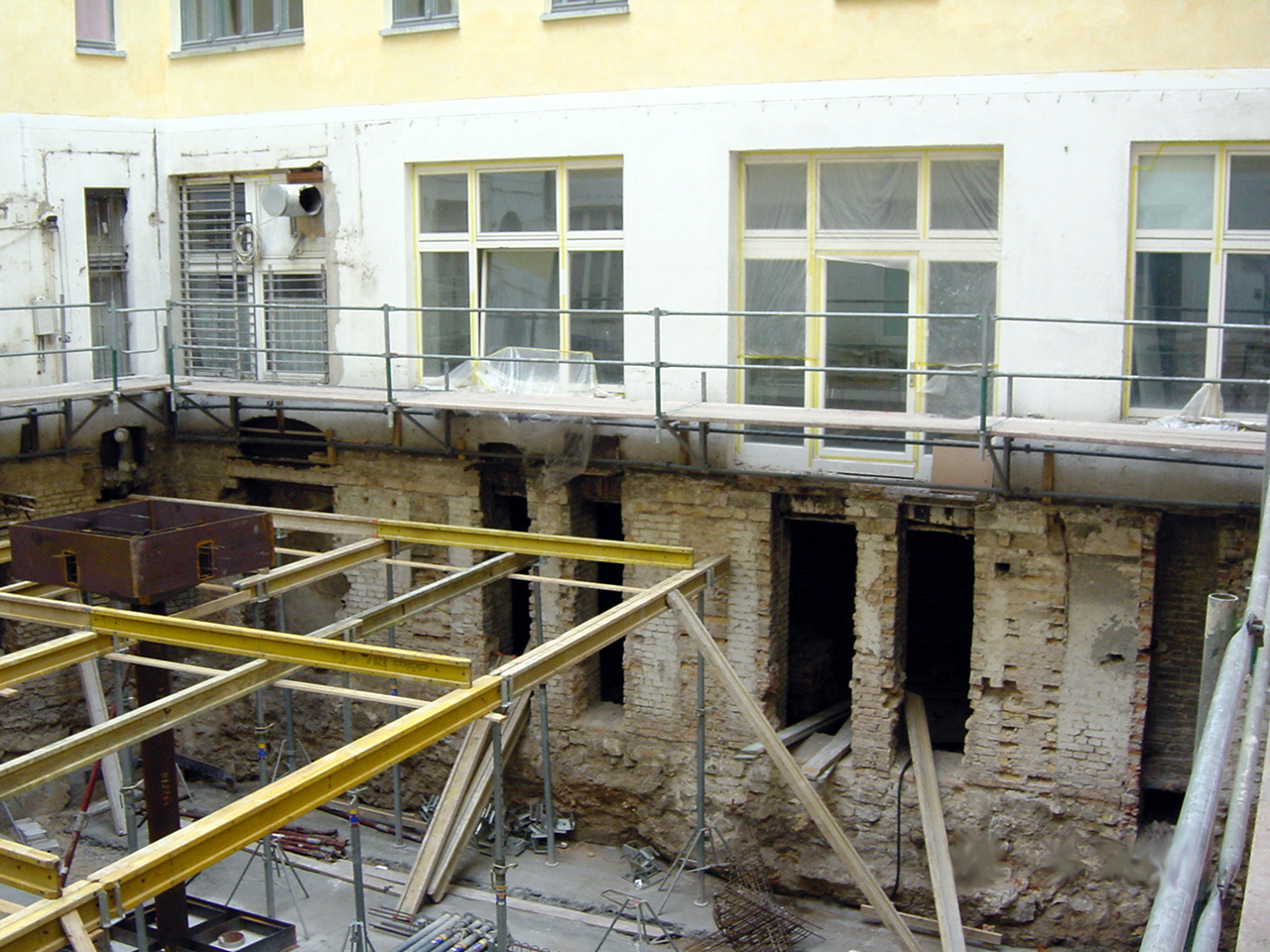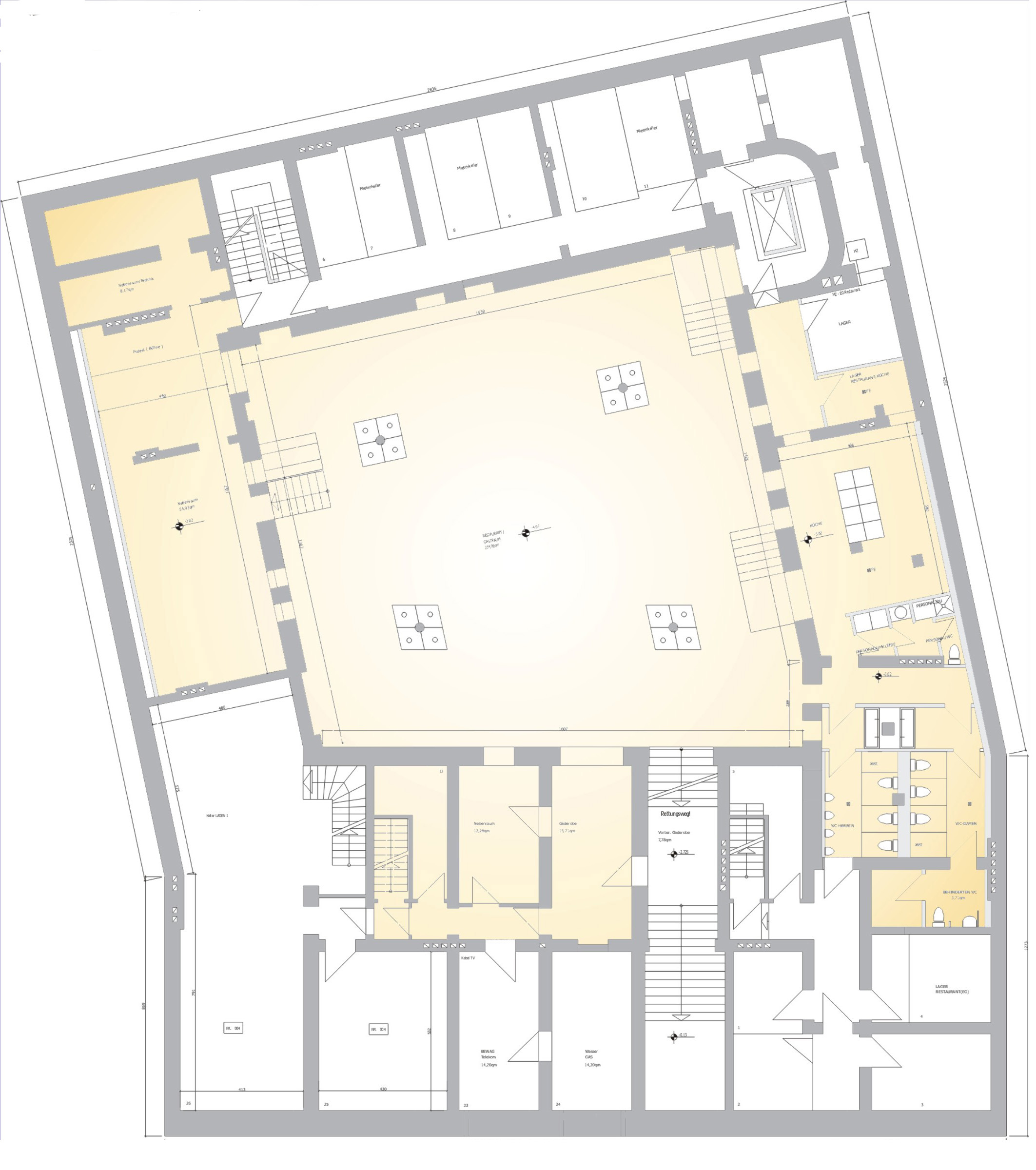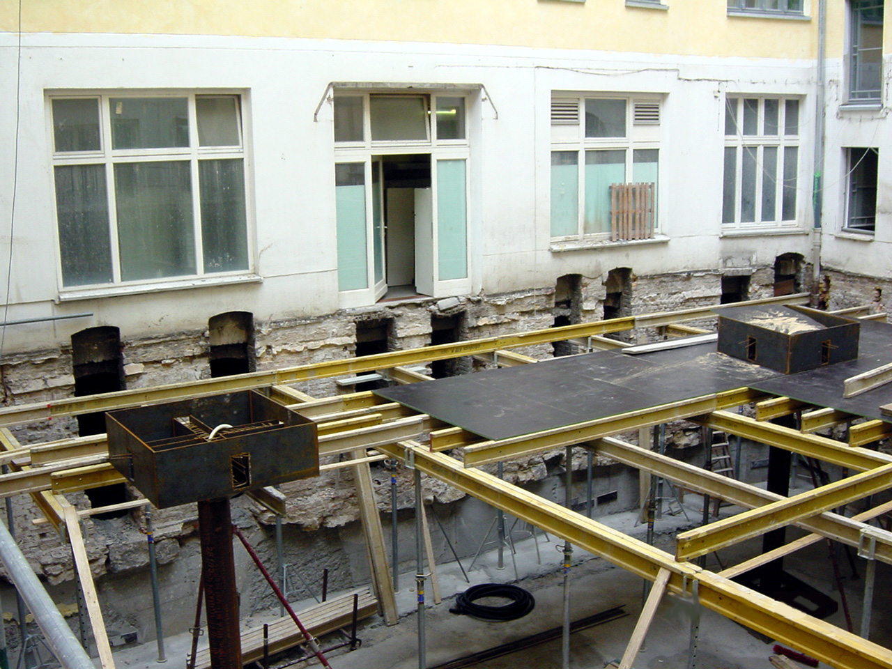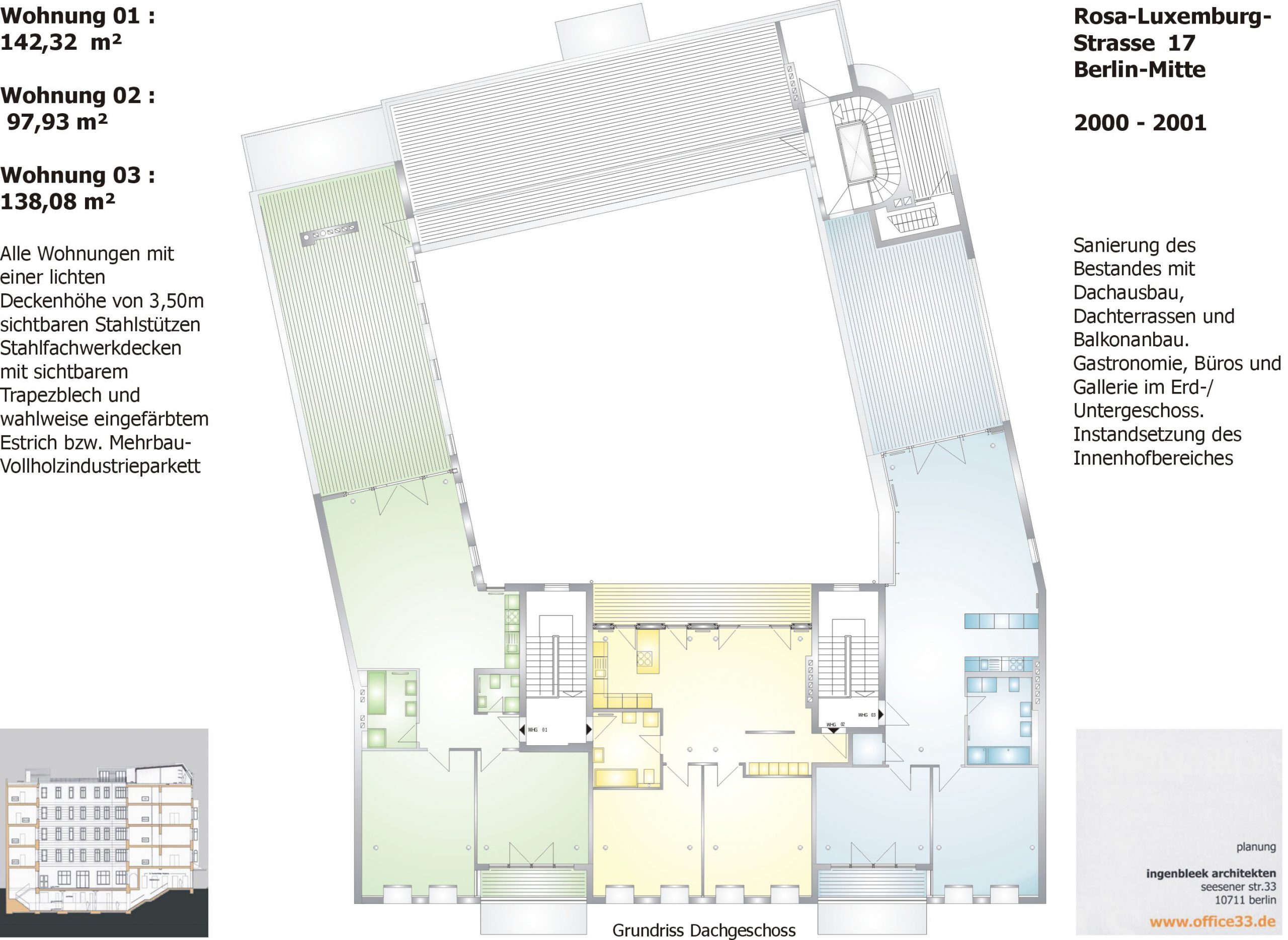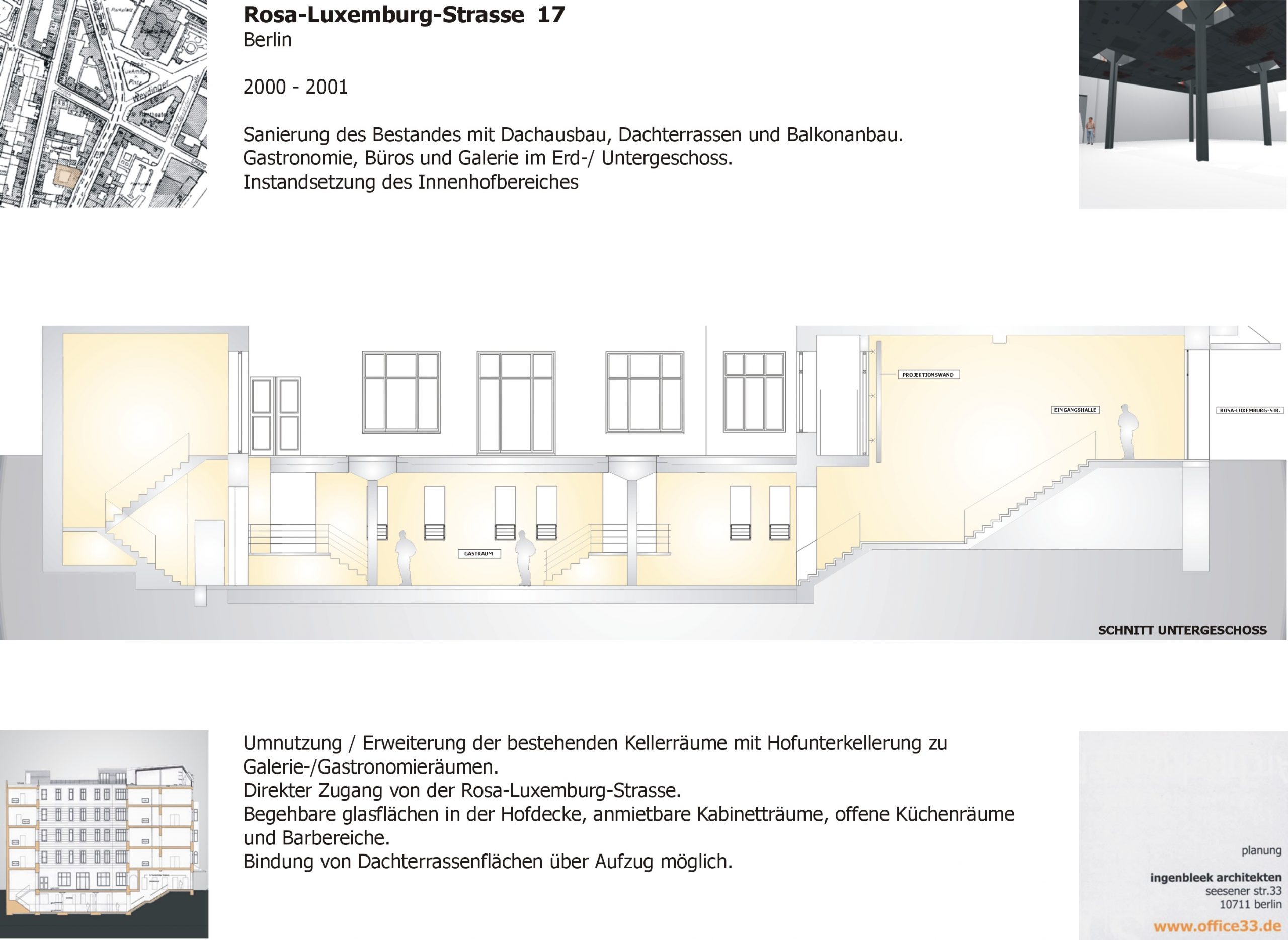 Die Sanierung des historischen Gebäudes in der Rosa-Luxemburg-Straße 17 umfasste die umfassende Ertüchtigung der Bestandsstruktur sowie eine präzise Weiterentwicklung im Dach- und Untergeschoss. Ein zentraler Eingriff war die vollständige Erneuerung der Kellerdecke. Die neue Konstruktion wird heute von eigens angefertigten Stahlstützen getragen, die die statische Last neu ordnen und zugleich die räumliche Offenheit des Untergeschosses ermöglichen. Entlang des Innenhofs wurde ein umlaufendes Oberlichtband in die Hofdecke integriert, ergänzt durch zusätzliche quadratische Oberlichter. Diese Maßnahme sorgt für eine natürliche Belichtung des Kellergeschosses und schafft zugleich eine visuelle Verbindung zwischen Innenhof und Untergeschoss. Der ehemals introvertierte Kellerbereich wird so Teil eines räumlich zusammenhängenden Gefüges mit klarer vertikaler Bezugnahme. Trotz der Lage im historischen Kontext – im Spannungsfeld denkmalpflegerischer Anforderungen – wurde das Dachgeschoss sensibel ausgebaut. Es entstanden drei hochwertige Wohnungen mit großzügigen Dachterrassen, die den Bestand respektvoll ergänzen und zugleich zeitgemäßen Wohnraum mit Weitblick über Berlin-Mitte schaffen.Das Projekt verbindet konstruktive Erneuerung mit architektonischer Präzision und stärkt die räumliche Durchlässigkeit zwischen Bestand, Hof und neu geschaffenen Wohnflächen.