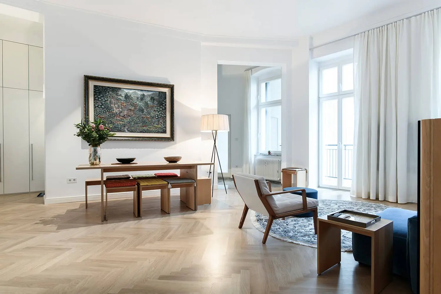 Der Umbau dieser klassischen Berliner Altbauwohnung, die seit den 1970er Jahren nicht modernisiert wurde, bringt historischen Charme und modernes Wohnen in Einklang. Alte Tapeten, Fliesen, veraltete Elektrik und verschachtelte Raumaufteilungen wurden durch ein offenes, lichtdurchflutetes Raumkonzept ersetzt. Der enge Flur und die kleinen Räume machen nun Platz für eine großzügige, offene Gestaltung. Die originalen Kastendoppelfenster wurden fachmännisch restauriert, sodass sie ihren historischen Charme bewahren und gleichzeitig moderne Anforderungen an Energieeffizienz erfüllen.