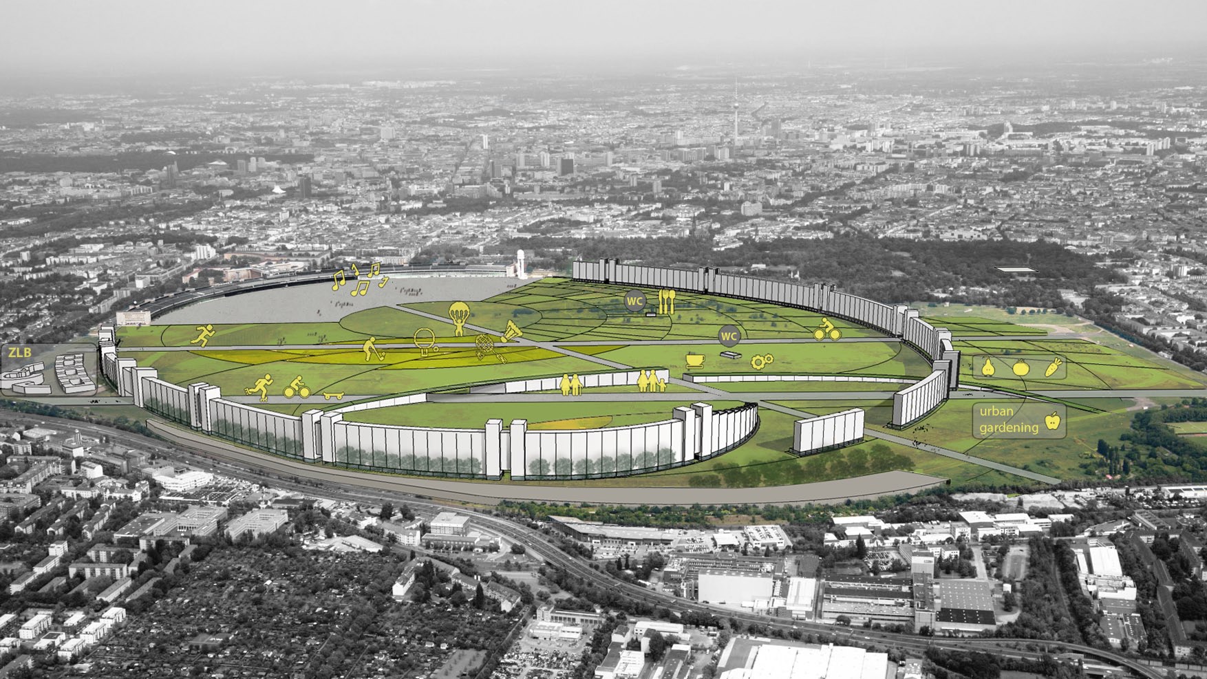 Diese Volumenstudie entstand auf Anfrage des Tagesspiegels und zeigt ein rein theoretisches, zugespitzes Szenario für Wohnbebauung auf dem Tempelhofer Feld. Sie basiert auf der Idee von hoher Dichte und geringer Flächenversiegelung – nicht auf realen Planungen. Von den 305 Hektar Gesamtfläche würden nur 2,7 % bebaut. Daraus ergibt sich eine potenzielle Bruttogrundfläche von ca. 970.000 m². Würde diese vollständig für Wohnungen genutzt, könnten theoretisch bis zu 12.900 Wohnungen entstehen. Mit einer angenommenen Mischung aus Wohnen, Gewerbe und sozialen Einrichtungen wären es etwa 7.100 Wohnungen.